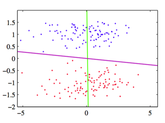 图 12.7 用于线性维度降低的主成分分析与Fisher线性判别分析的对比。这里,数据位于二维空间中,属于两个类别,用红色和蓝色表示。数据要被投影到一维空间中。PCA选择了最大方差的方向,由紫色直线表示,它产生了严重的类别覆盖。而Fisher线性判别分析考虑类别标签,产生了在绿色直线上的投影。 这种投影对类别的区分效果要好得多。