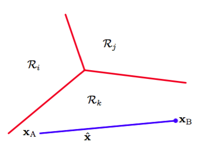 这样的判别式得到的决策区域总是单连通且凸的。为了证明这个,让我们考虑图4.3中展示的,两个都位于决策区域中的点。